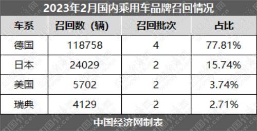 分车系来看,2月,宝马、奔驰、奥迪三大德系豪华车品牌累计召回乘用车118758辆,占召回总量的77.81%,数量最多。日系两品牌召回24029辆,占比15.74%。美系和瑞典品牌召回数量均不足万辆,分别召回5702辆和4129辆,各自占比3.74%和2.71%。