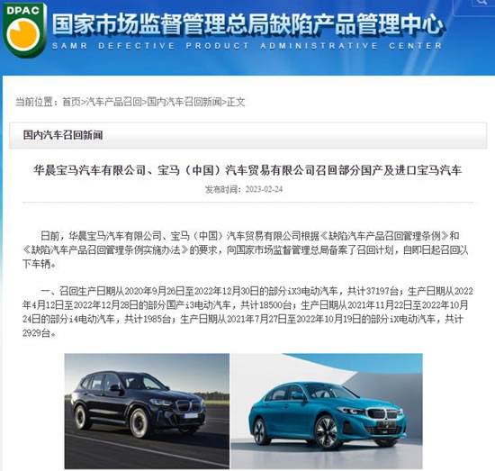 宝马召回车辆包括37197辆iX3、18500辆国产i3、1985辆i4和2929辆iX,召回原因是“车辆高压蓄电池控制单元(SME)微控制器电压监控阈值设定不合理,软件可能误判,导致车辆充电意外中断或高压系统关闭,极端情况下会造成动力中断”。另有33021辆国产i3和iX3的召回原因是“车辆的行人保护警示音控制单元的软件信号处理逻辑存在问题,可能导致车辆在低速行驶或者倒车时无法发出外部行人保护警示音,增加行人受伤的风险”。