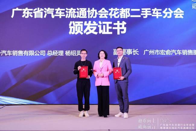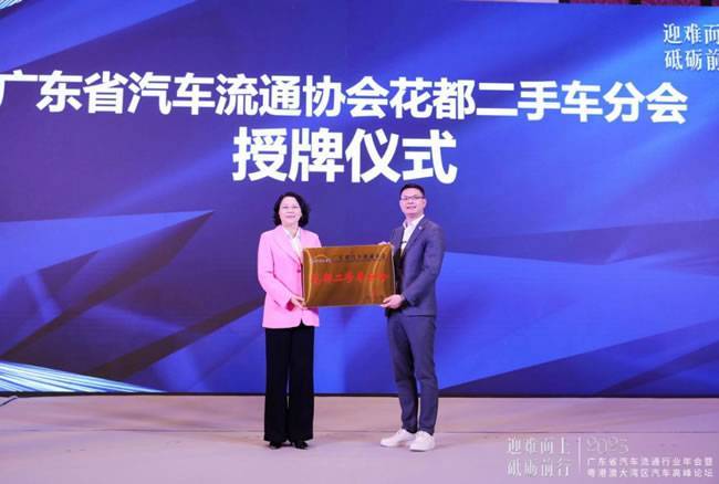 广东省汽车流通协会严斐会长为花都二手车分会授牌。