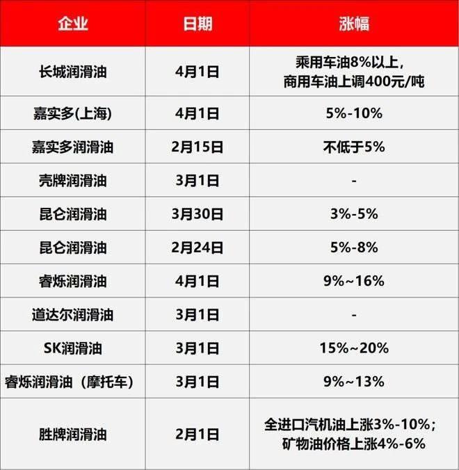 【长城、嘉实多、昆仑等润滑油企业带领开启4月涨价潮】