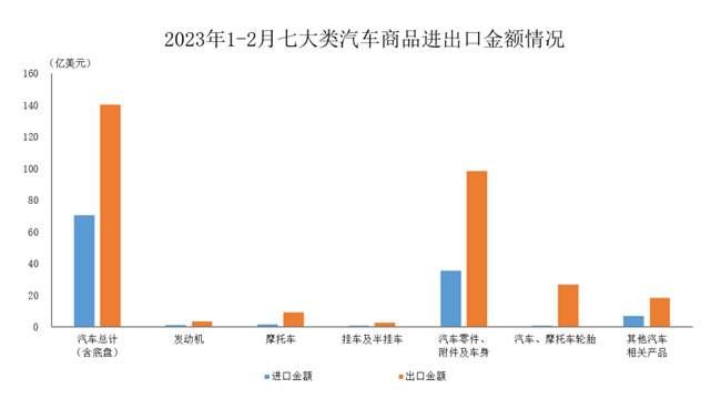 2023年1-2月,全国汽车商品累计进出口总额为414.2亿美元,同比增长20.7%。其中进口金额116.2亿美元,同比下降26.3%;出口金额298亿美元,同比增长60.7%。