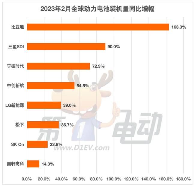 同比增幅来看,得益于比亚迪销量的“狂飙”,其动力电池装机量也随之大幅提升,同比增长达163.3%,其次是三星SDI、宁德时代和中创新航,同比增长分别为90%、72%和55%。LG新能源、松下同比均超30%,国轩高科同比增幅放缓仅14.3%。