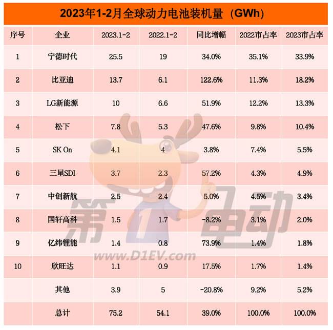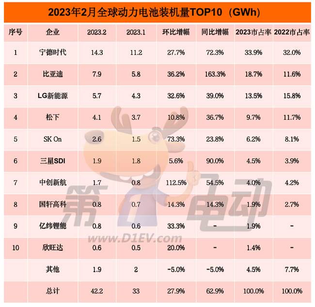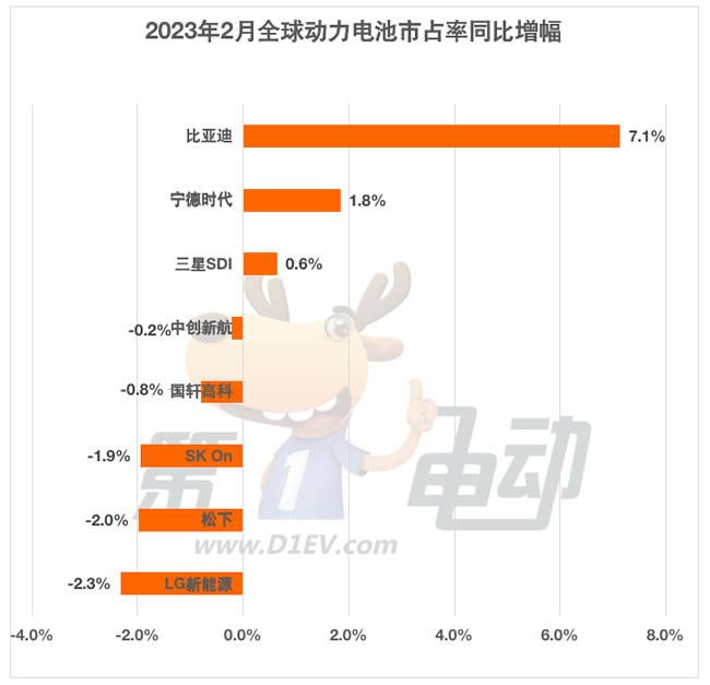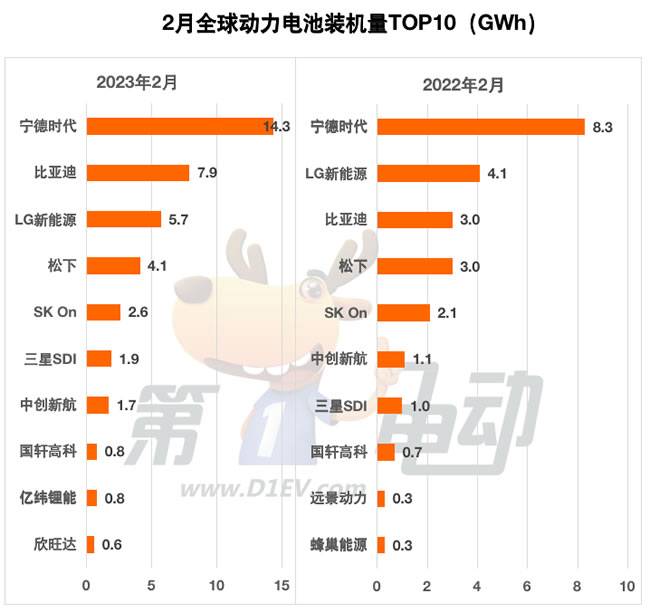 与去年同期相比,2月,得益于“后宫佳丽”无数的宁德时代仍然稳居冠军。最大的变化是,比亚迪连超松下和LG新能源夺得亚军,而后两者的市场份额均在下降,排名降至第三、第四。三星SDI超过中创新航位居第六,国轩高科稳居第8。蜂巢能源和远景动力落榜,取而代之的是亿纬锂能和欣旺达。