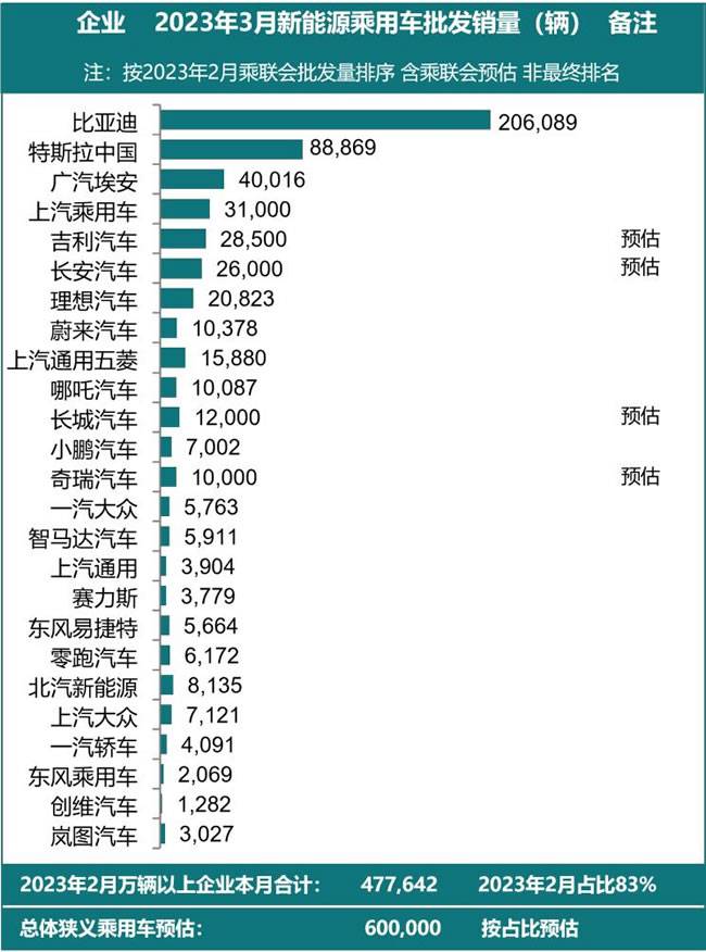 乘联会2023年2月,全国乘用车市场新能源销量万辆以上的10家厂商,批发销量占总体新能源乘用车全月销量的83%,这些企业的3月预估销量为47.7万辆,按照正常结构占比预测,3月的全国新能源乘用车销量在57万多。考虑到部分中小企业的新能源车销量较2月改善较大,因此3月乘用车市场可偏乐观些。