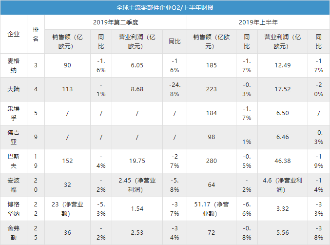 针对全球主流零部件企业业绩下滑,多家企业归咎于2019年全球经济发展持续低迷、贸易争端、欧洲国家债务水平居高不下,以及汽车生产放缓的因素。诸多企业的高管也一致认同下半年逆风形势不会缓解,因此纷纷调低了原先公布的销售目标预期。