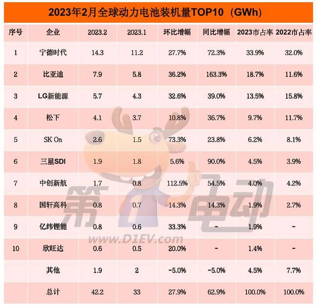 3、2月全球动力电池榜:比亚迪市占率提升超7%,稳居亚军