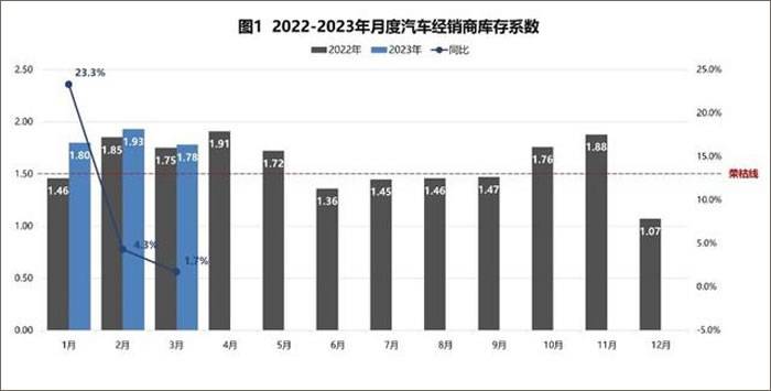 4月10日,中国汽车流通协会发布2023年3月“汽车经销商库存”调查结果:3月份汽车经销商综合库存系数为1.78,环比下降7.8%,同比上升1.7%,库存水平位于警戒线以上。