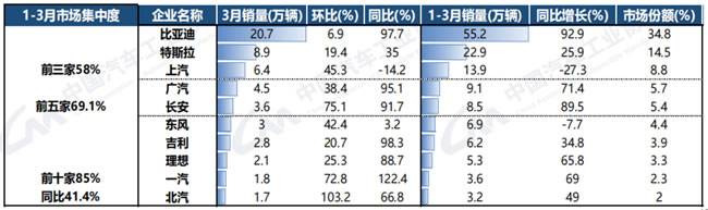 1-3月,新能源汽车销量排名前十位的企业集团销量合计为134.8万辆,同比增长41.4%,占新能源汽车销售总量的85%,高于上年同期9.2个百分点。比亚迪销量在高基数上维持了高增速,长安销量增速也保持高增长。