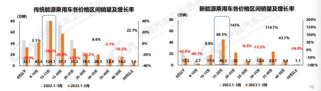 1-3月,传统能源乘用车中,8-10万、30-35万、50万以上车型同比呈现正增长,其中50万以上车 型涨幅最大。目前销量仍主要集中在10-15万价格区间,累计销量124.1万辆,同比下降18.2%。