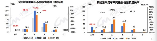 1-3月,传统能源乘用车,C级同比增长9.8%,其余各级别均呈不同程度下降态势。目前销量仍主 要集中在A级,累计销量202.9万辆,同比下降19.7%。