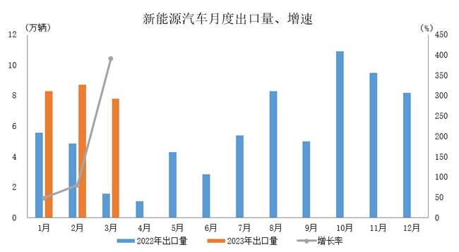 2023年3月,新能源汽车出口7.8万辆,环比下降10.3%,同比增长3.9倍。