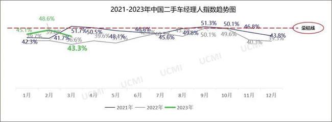 从中国汽车流通协会(以下简称“流通协会”)官方获悉,中国汽车流通协会发布最新一期“中国二手车经理人指数”(UCMI)显示,3月二手车经理人指数为43.3%,处于荣枯线以下,二手车市场景气度处于不景气区间。