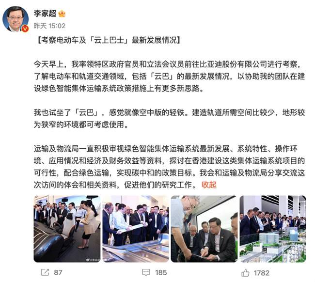 在试乘之后,李家超在个人社交媒体专页发文称,比亚迪之行旨在拓展建设绿色智能集体运输系统政策的思路。他试坐“云巴”的感觉像空中版轻铁,建造轨道所需空间比较少,地形较为狭窄的环境都可考虑使用。李家超说,他会和运输及物流局分享交流这次访问的体会和相关资料,促进他们的研究工作。