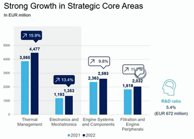 4月25日,马勒集团在新闻发布会上公布,2022年,集团销售额达到124亿欧元,最终实现了14%的同比增长,这一表现已经超过了2019年疫情前的水平。值得一提的是,马勒在所有主要的战略核心业务上均取得了增长,其中热管理业务部门为公司贡献了三分之一的销售额,同比大增15.9%;电子和机电一体化业务部门销售额同比上涨13.4%;内燃机系统和零部件业务部门实现9.8%的增长;滤清器与内燃机周边零部件业务部门也同比大增11.7%。