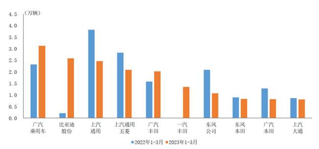 在上述十家企业中,与上年同期相比,广汽乘用车、比亚迪股份、广汽丰田和一汽丰田销量呈明显增长,其他企业呈不同程度下降。