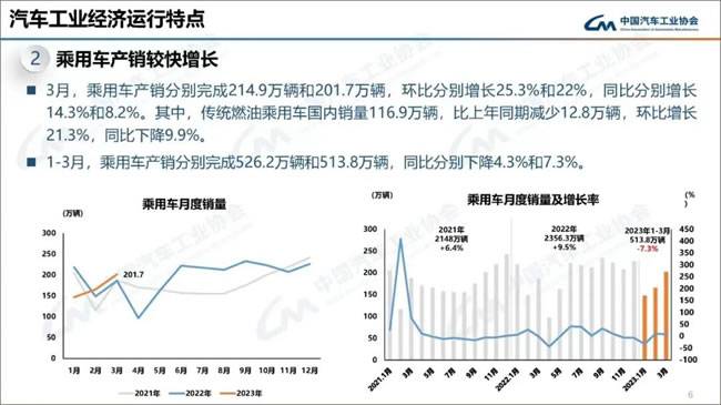 2023年3月,乘用车产销分别完成214.9万辆和201.7万辆,环比分别增长25.3%和22%,同比分别增长14.3%和8.2%。2023年1-3月,乘用车产销分别完成526.2万辆和513.8万辆,同比分别下降4.3%和7.3%。