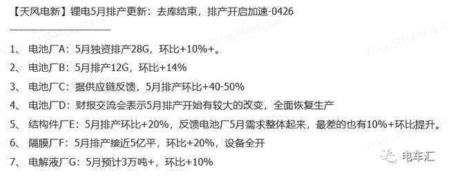 而根据天风电新从相关企业内部调研的信息,5月份电池上下游企业的排产有明显提升。