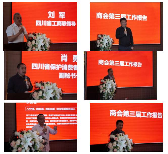 会上,四川省工商联一级调研员刘军、四川省保护消费者权益委员会副秘书长肖勇,对商会换届选举大会的召开表示热烈的祝贺并发表致辞。刘军强调,商会应强化“听党话、跟党走”的政治信念,在积极对接中央、四川省重要战略和政策导向中抢抓机遇,要有敢争上游的勇气,做高质量发展的开拓者,增强家国情怀,做社会主义的担当者。
