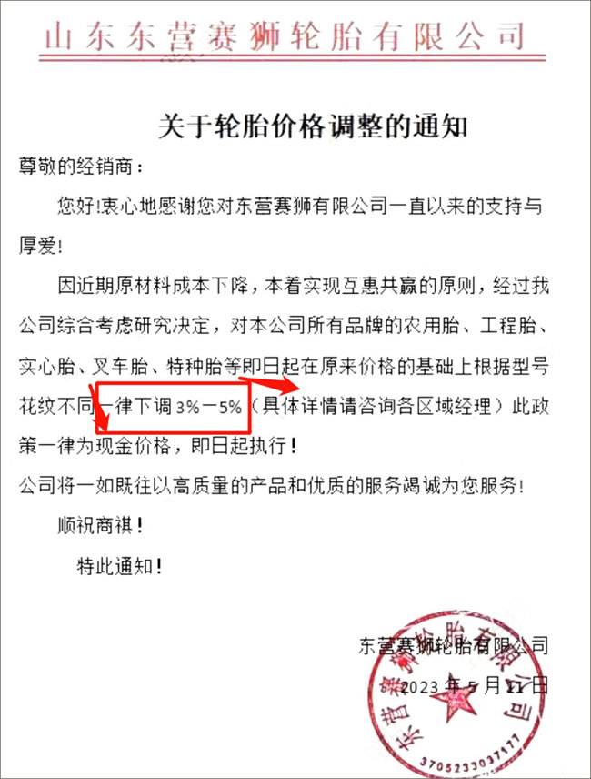 5月11日,山东东营赛狮轮胎有限公司发布价格调整通知。表示由于近期原材料成本下降,决定自5月11日起对该公司所有品牌的农用胎、工程胎、实心胎、叉车胎、特种胎等在原来价格基础上根据型号、花纹不同一律下调3%-5%。
