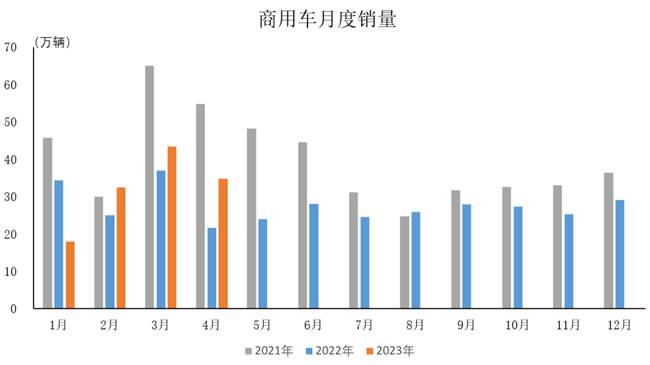 2023年4月,商用车产销分别完成35.5万辆和34.8万辆,环比分别下降18.4%和19.9%,同比分别增长68.8%和60.5%。