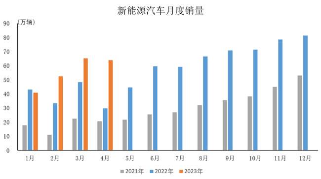 2023年4月,新能源汽车产销分别完成64万辆和63.6万辆,环比分别下降5%和2.5%,同比均增长1.1倍。