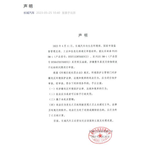 5月25日,长城汽车官微发布一篇声明,声明内容显示,2023年4月11日,长城汽车向生态环境部、国家市场监督管理总局、工业和信息化部递交举报材料,就比亚迪秦PLUS DM-i、宋PLUS DM-i采用常压油箱,涉嫌整车蒸发污染物排放不达标的问题进行举报。