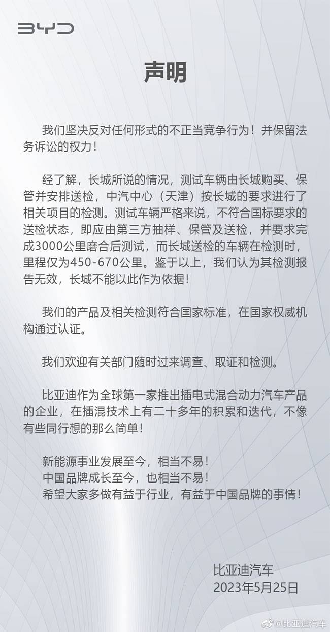 对于上述声明,盖世汽车分别向长城汽车和比亚迪方面进行求证,长城汽车的回复是:以声明信息为准。