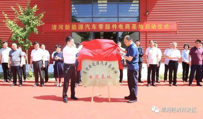 ■县委书记张剑、县长闫恒卓共同为清河新能源汽车零部件电商基地揭牌。