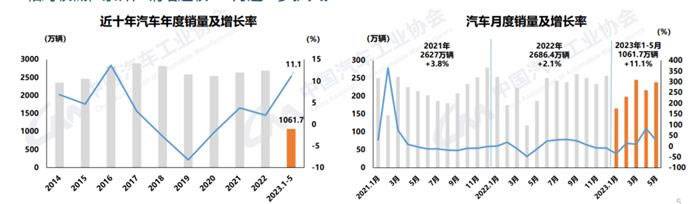 1-5月,汽车产销分别完成1068.7万辆和1061.7万辆,同比均增长11.1%。由于去年4-5月同期基数相对较低,累计产销增速较1-4月进一步扩大。