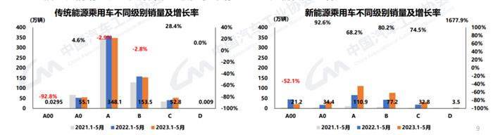 1-5月,传统能源乘用车,A0级和C级车同比均呈正增长,A00级、A级、B级车同比呈不同程度下降。目前销量仍主要集中在A级,累计销量348.1万辆,同比下降2.9%。