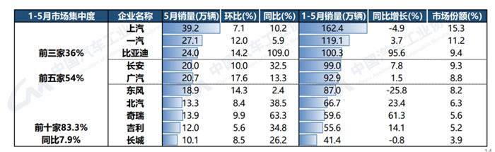 1-5月,新能源汽车销量排名前十位的企业集团销量合计为249.8万辆,同比增长62.8%,占新能源汽车销售总量的85%,高于上年同期8.3个百分点,整个新能源市场依旧处在快速增长阶段。比亚迪销量继续在高基数上维持高增速,1-5月累计销量超过100万辆,同比增长97.7%。理想、广汽和一汽同比增速均超过一倍。