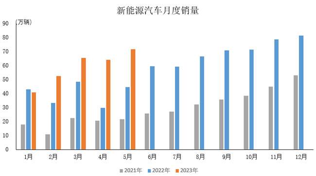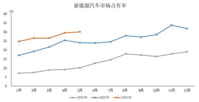 2023年5月,新能源汽车产销分别完成71.3万辆和71.7万辆,环比分别增长11.4%和12.6%,同比分别增长53%和60.2%,市场占有率达到30.1%。