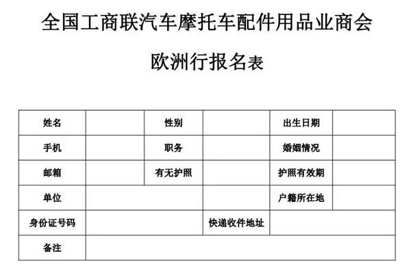 为更好贯彻落实“中国制造2025”国家发展战略,加强汽车后市场企业对外交流与合作,全国工商联汽车摩托车配件用品业商会将于2018年9月10日至22日组团赴欧洲考察,并参加9月11日至15日在德国法兰克福举行的“德国法兰克福汽车及零配件展(Automechanika Frankfurt)”。考察有关事项如下: