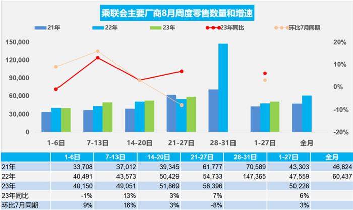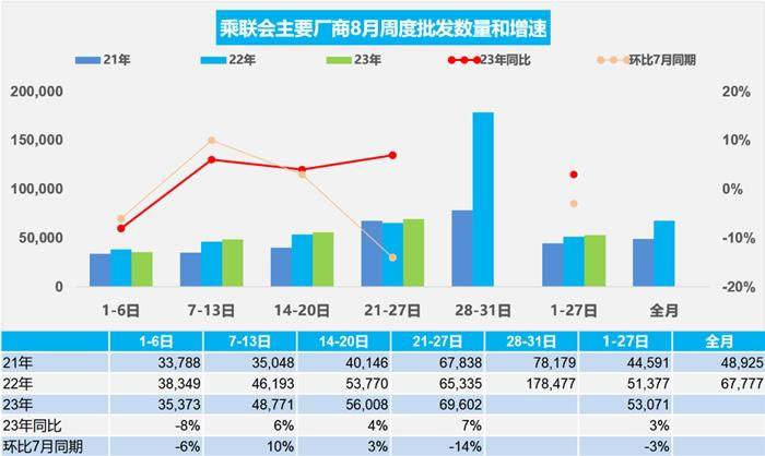 8月1-27日,全国乘用车厂商批发143.3万辆,同比去年同期增长3%,较上月同期下降3%;今年以来累计批发1,456.4万辆,同比增长6%。