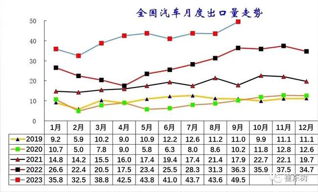 10月25日,从乘联会秘书长崔东树处获悉,2023年9月中国汽车实现出口50万台,出口增速36%的持续强增长。2023年1-9月中国汽车实现出口371万台,出口增速60%的持续强增长,已经超过2022年全年的340万台。2022年中国对俄罗斯出口16万台,2023年1-9月中国对俄罗斯汽车出口64万台,同比增长652%。9月中国对俄罗斯出口9.5万台车,同比增长589%,其中重卡和牵引车等出口暴增对俄罗斯贡献巨大。