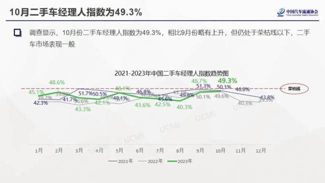11月1日,中国汽车流通协会发布最新一期“中国二手车经理人指数”(UCMI)。本期UCMI结果显示,10月份二手车经理人指数为49.3%,相比9月份略有上升,仍处于荣枯线之下,二手车市场表现一般。