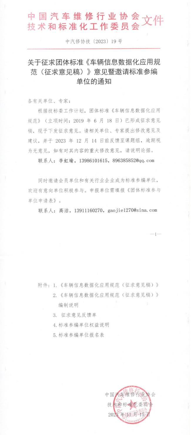 根据技标委工作计划,团体标准《车辆信息数据化应用规范》(立项时间:2019 年 6 月 18 日)已形成征求意见稿,现予下发征求意见。请相关单位、专家提出修改意见及建议,并于 2023 年 12 月 14 日前反馈至课题组,逾期视为无意见,如有对其内容的重大修改意见,请说明论据。详情如下: