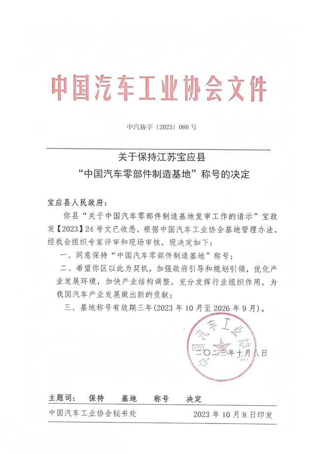 近日,在北京传来喜讯:经过中国汽车工业协会的考核认定,宝应县顺利通过基地复审,再次成为全国二十家之一的“中国汽车零部件制造基地”。