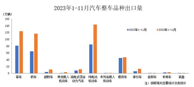 2023年1-11月,汽车整车共出口476.2万辆,同比增长59.6%;整车出口金额927.1亿美元,同比增长70.7%。在汽车主要出口品种中,与上年同期相比,纯电动机动车、客车、轿车和载货车四大类主要出口量保持不同程度增长,其中轿车和纯电动机动车增速更为显著。2023年1-11月,上述四大类品种共出口431.1万辆,占汽车出口总量的90.5%。