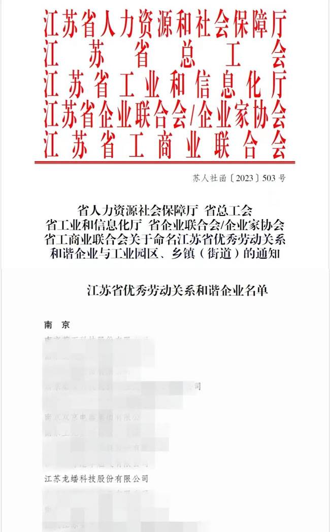 【龙蟠科技荣获“江苏省优秀劳动关系和谐企业”认证】