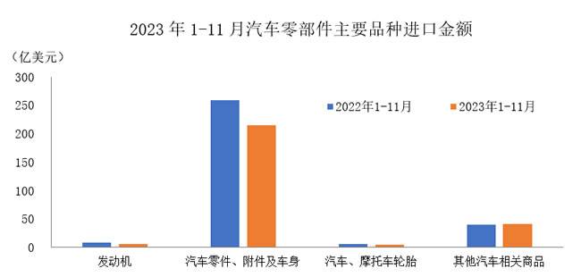 2023年1-11月,汽车零部件进口金额268.3亿美元,同比下降14.4%。在汽车零部件主要品种中,与上年同期相比,其他汽车相关产品进口金额小幅增长,其他三大类汽车零部件品种进口金额均呈较快下降。