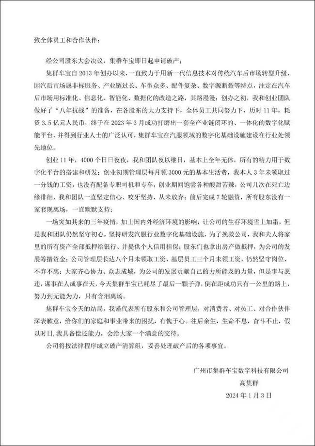 1月3日,一份关于集群车宝致全体员工和合作伙伴的“通告”在朋友圈流传,记者发现,此前所加入的由集群车宝创建的客户群已于当日晚间解散。另外,据某媒体记者消息,接近集群车宝的圈内人士透露,即将申请破产的集群车宝负债超1亿元。