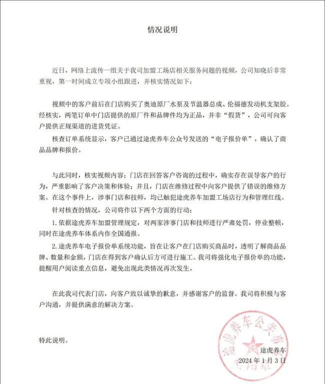 声明称,视频中客户前后在门店购买奥迪原厂水泵及节温器总成、伦福德发动机支架胶。经核实,两笔订单中门店提供的原厂件和品牌件均为正品,并非“假货”,公司可提供正规渠道的进货凭证。同时,门店在回答客户咨询的过程中,确实存在误导客户的行为,严重影响客户决策和体验。并且,门店在维修过程中向客户提供了错误的维修方案。在这件事上,涉事门店与技师均已触犯公司加盟工厂店行为和管理红线。