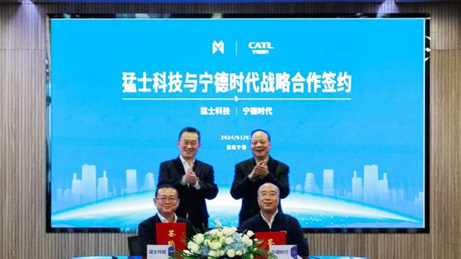 1月3日,猛士科技同宁德时代在福建宁德签署三年战略合作协议。根据协议,宁德时代作为猛士科技汽车动力电池的首选合作伙伴,将全力支持猛士科技整车开发及生产,向猛士科技提供具有竞争力的汽车动力电池产品和服务。同时,双方还将充分发挥各自优势,在新型电池产品开发、神行超充电池应用、科技创新项目、市场推广等多个维度展开紧密合作。