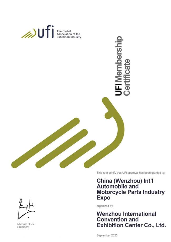 9月,“中国(温州)国际汽摩配博览会”通过全球展览业协会(UFI)资格认证,是浙江省汽配会展项目中首个获得UFI国际认证项目。此次UFI认证,标志着温州汽配展正式加入国际性品牌展会行列,是温州汽配展走向规模化、国际化、品牌化的重要表现。
