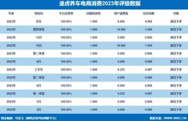 其中,途虎养车在“2023全国全部领域消费评级榜”和“2023年全国数字零售领域消费评级榜”中均位列第一。根据监测数据,2023年途虎养车共获得12次消费评级,12次均获得“建议下单”评级,2023年整体消费评级也为“建议下单”评级。据悉,该评级主要考量平台反馈率、回复时效性、用户满意度等指标。