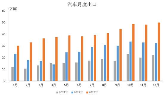 2023年12月,汽车出口49.9万辆,环比增长3.5%,同比增长54.3%。