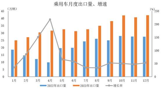 2023年12月,乘用车出口42.2万辆,环比增长3.7%,同比增长53.3%。 2023年,乘用车出口414万辆,同比增长63.7%。