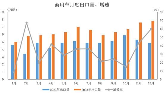 2023年12月,商用车出口7.8万辆,环比增长2.5%,同比增长59.9%。 2023年,商用车出口77万辆,同比增长32.2%。