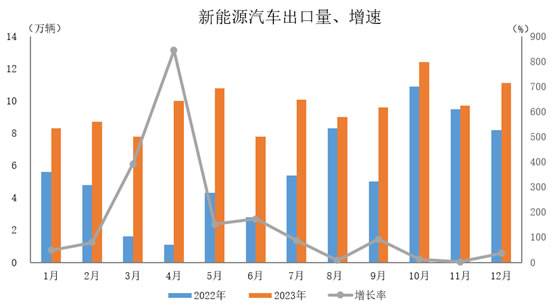 2023年12月,新能源汽车出口11.1万辆,环比增长15.2%,同比增长36.5%。 2023年,新能源汽车出口120.3万辆,同比增长77.6%。